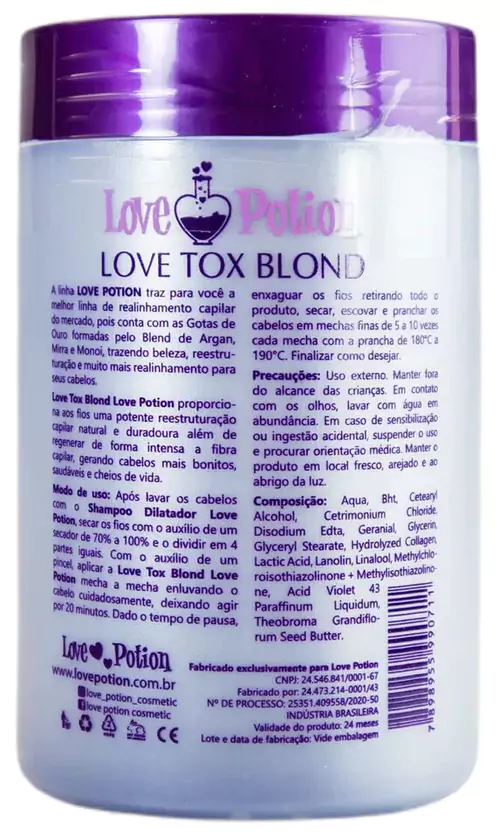 Love Tox Blond Potion is a molecular mass replenisher that acts on the cortex of the hair fiber. Suitable for all hair types, it has an innovative and effective formula, with keratin and silicone, forming a protective film that wraps the strands from root to tip. restoring the hair’s natural flexibility and providing hydration and resistance to the hair.