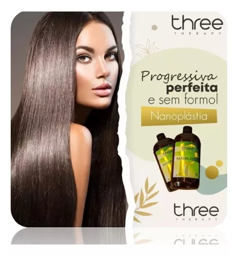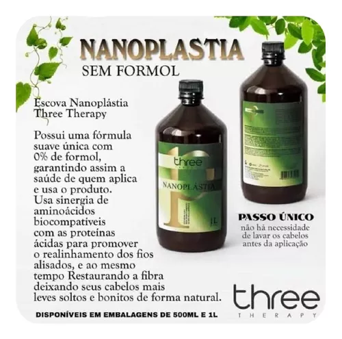 The main active ingredients of Nanoplastia are: shea butter, polyquaternium 39 and hyaluronic acid. Shea Butter – responsible for shine, flexibility and softness. Contains antioxidants (UVA and UVB), removes dead cells, helps absorb and retain moisture, softens the scalp and has healing and scarring properties. Polyquaternium 39 – promotes a fortifying film-forming effect, improves the structural integrity of the hair, softening the cuticle and increasing penetration, making it easier to comb dry or wet. Hyaluronic acid – Has a high water retention capacity that is up to a thousand times its weight. It is an active ingredient that is as important for hydration as it is for maintaining hair health. Contains: – 01 Progressive Nanoplasty Straightening Without Formaldehyde 1 Lt Three Therapy